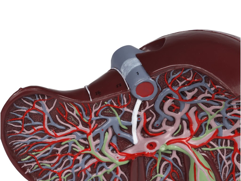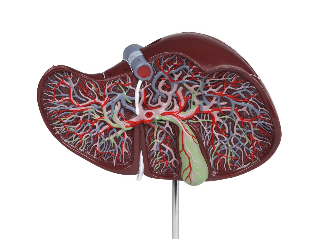 Anatomický model K108 zobrazuje pečeň zväčšenú 1,5-krát, rozrezanú tak, aby odkryl vnútorné rozdelenie artérií, vén, portálnej žily a žlčovodu. Upevnený na stojane, rozmery cca 15 × 26 × 12 cm, hmotnosť približne 1 kg.