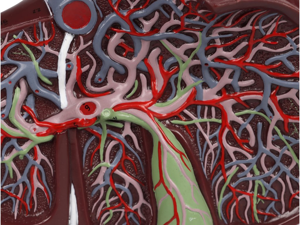 Anatomický model pečene, 1,5-násobne zväčšený K108 od ERLER ZIMMER je detailná výučbová pomôcka určená na štúdium anatómie pečene, cievneho zásobenia a žlčového systému. Model umožňuje prezrieť vnútorné štruktúry orgánu, ako sú: