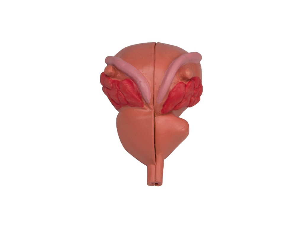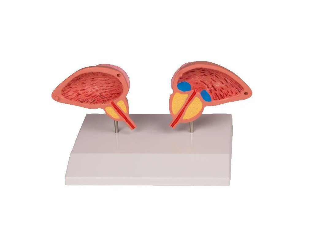 Anatomický model 1261 zobrazuje zdravú prostatu spolu s močovým mechúrom na jednej polovici a zväčšenú prostatu s benígnou hyperpláziou prostaty (BPH) na druhej polovici. Ukazuje úzky močový kanál, zvyškové močenie a rozdiely medzi zdravou a chorou prostatou.