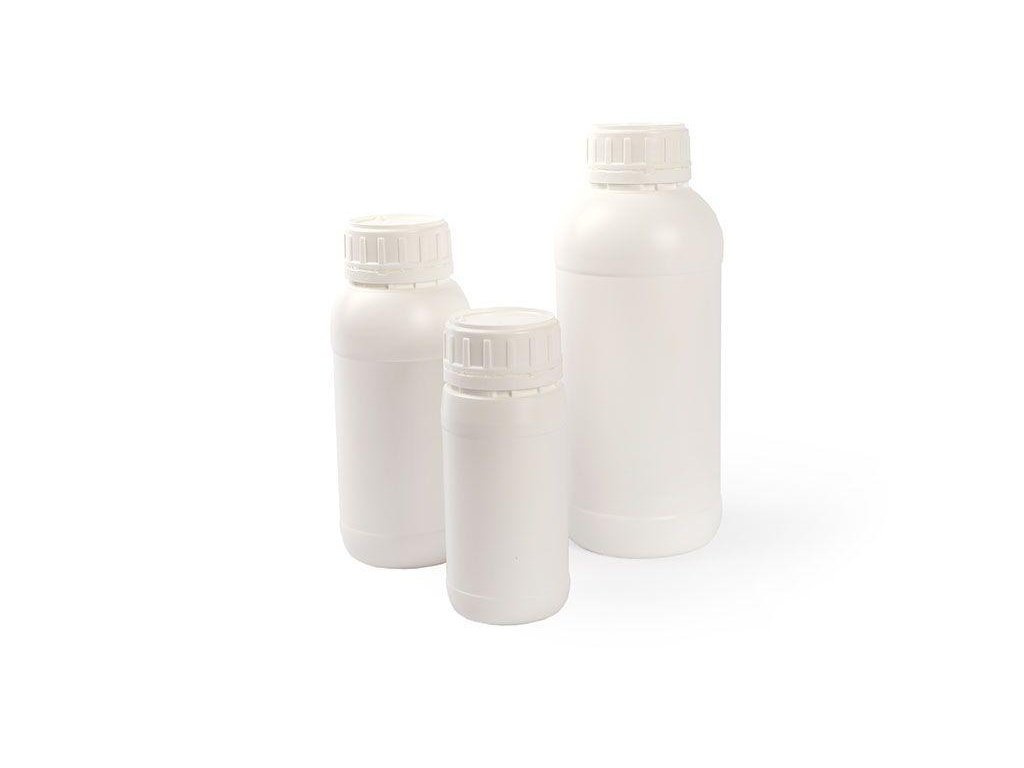 Okrúhla HDPE fľaša s hrdlom Ø 41 mm (DIN 50) a skrutkovacím uzáverom s tesnením a bezpečnostným krúžkom. Vhodná pre tekutiny, prášky a granule, ideálna aj na fotosenzitívne látky.