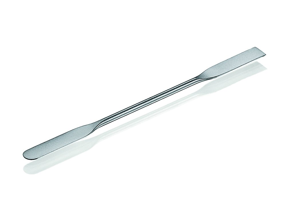 Dvojitá špachtľa je vyrobená z nehrdzavejúcej ocele 1.4301, ktorá poskytuje vysokú odolnosť, pevnosť a hygienickosť pri laboratórnej práci.