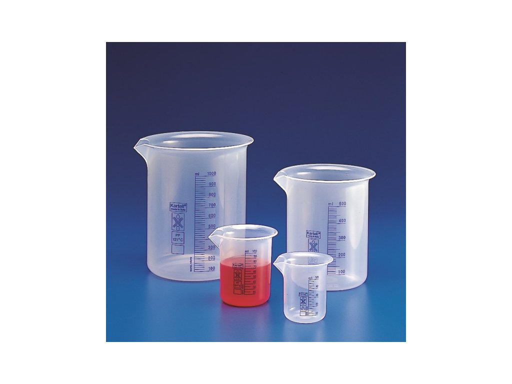 Kadička nízkej formy z PP plastu s modrou trvalou stupnicou, autoklávovateľná do 121 °C, s vysokou priesvitnosťou a chemickou odolnosťou – Karell Labware, trieda B.