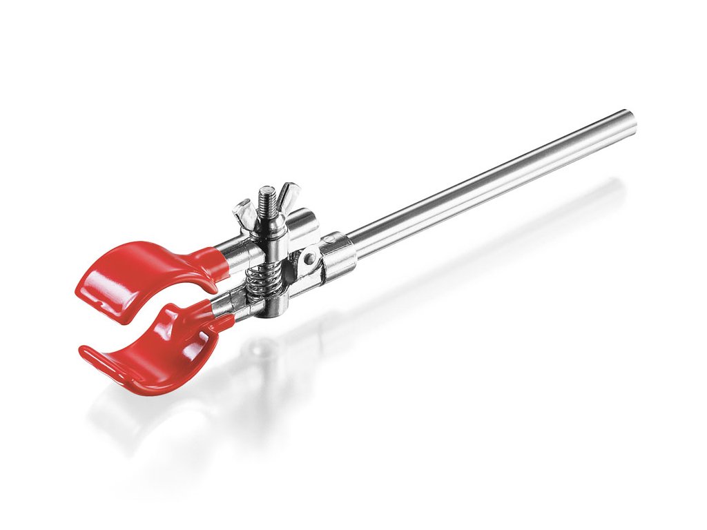 Laboratórny držiak z tlakovo liateho zinku s niklovaným povrchom, vinylom potiahnutými čeľusťami a tyčou Ø 10 mm.