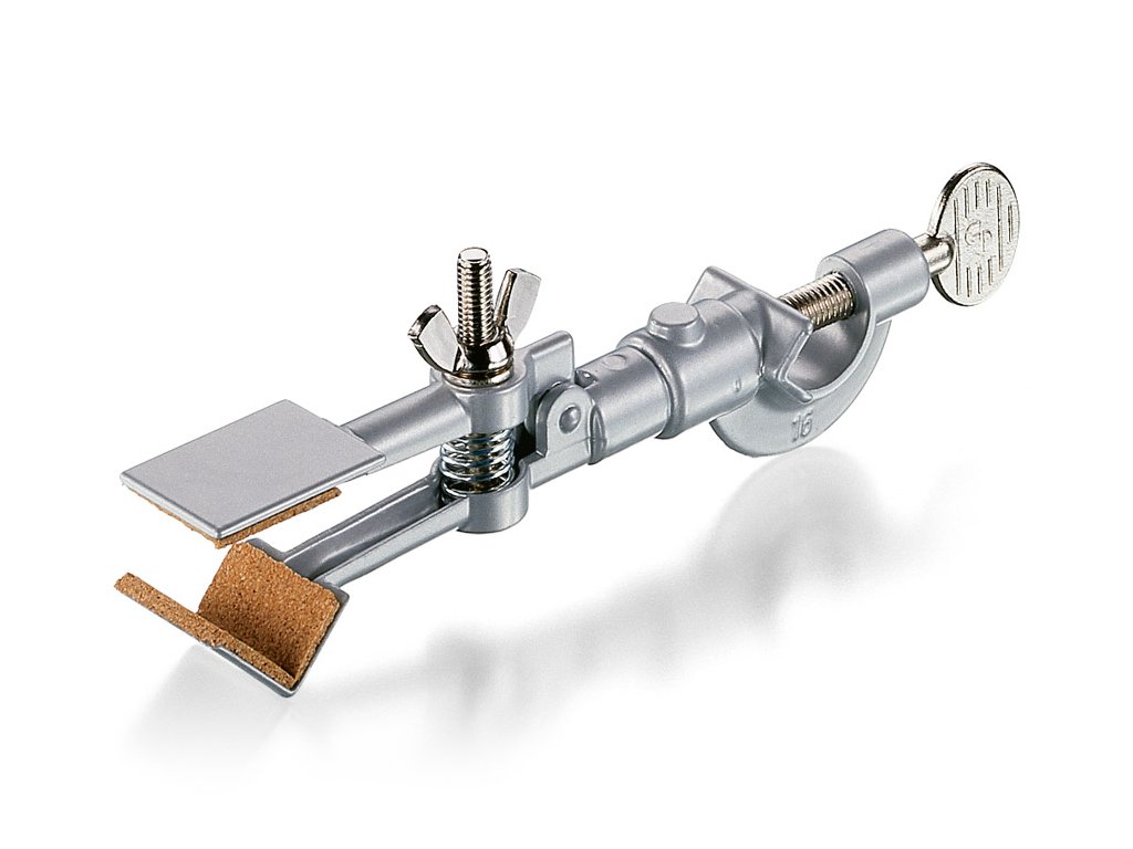 Laboratórny držiak so svorkou z tlakovo liateho zinku s práškovým lakovaním a čeľusťami s korokovou vložkou.