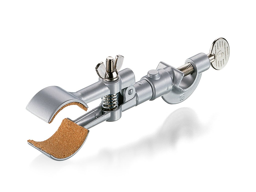 Čeľuste držiaka sú vystlané korokovou vložkou, ktorá zabezpečuje šetrné, neabrazívne a protišmykové uchytenie laboratórneho skla alebo citlivých komponentov.