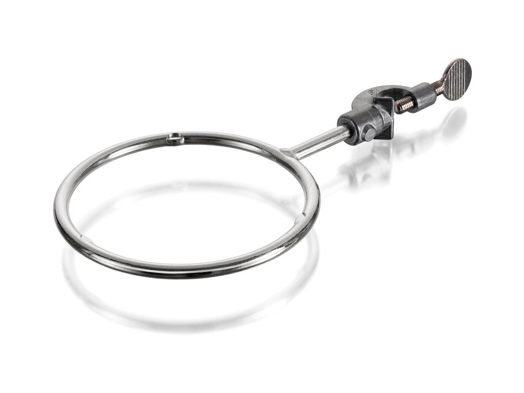 Laboratórny kruh z ocele (Ø 8 mm) s pozinkovaným povrchom, trojbodovou oporou a svorkou z tlakovo liateho zinku vybavenou niklom pokovenou mosadznou skrutkou.