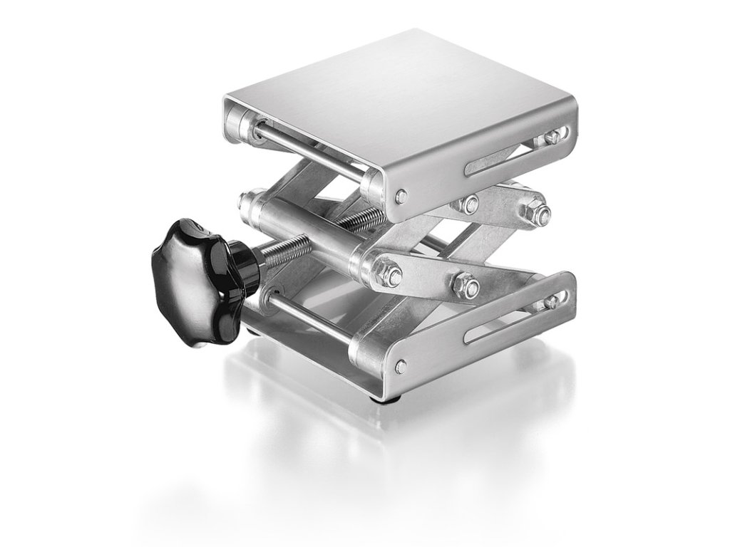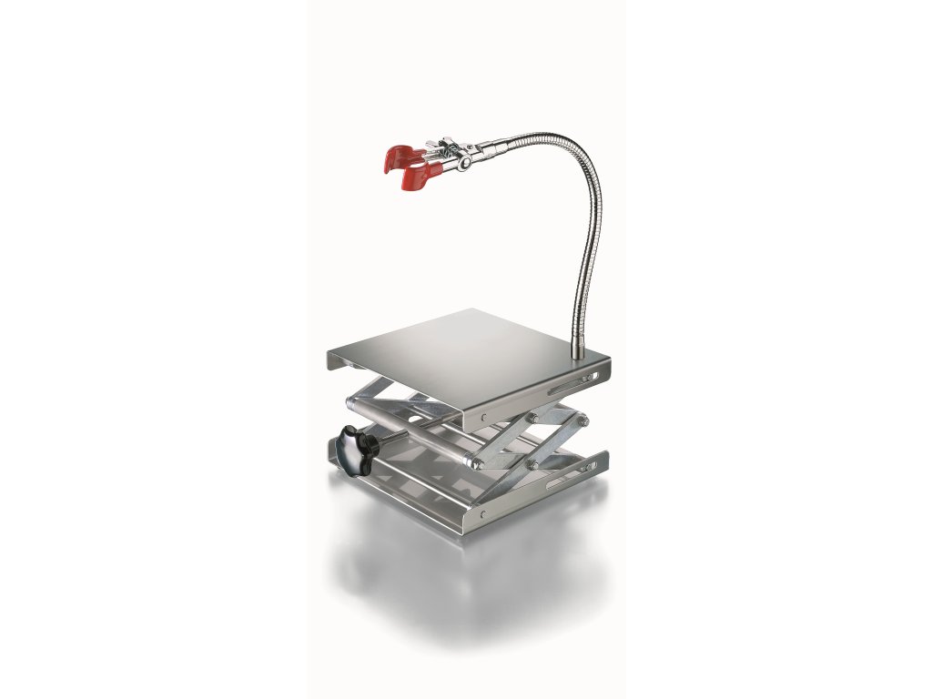 Laboratórny zdvihák podľa normy DIN 12897 s nerezovými platňami, strihovo odolnou konštrukciou, vrchnou platňou s otvorom Ø 10 mm pre flexibilné držiaky č. 2684 a 2686 a s gumovými nožičkami.