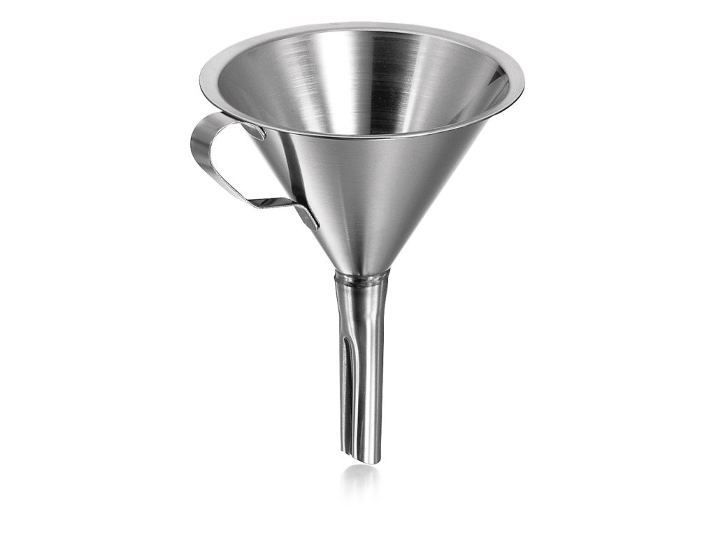 Lievik z nehrdzavejúcej ocele s vzduchovým kanálom a rukoväťou.