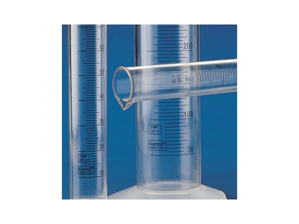 Odmerný valec z PMP plastu s modrou trvalou stupnicou, autoklávovateľný do 170 °C, bez menisku, vhodný pre laboratóriá aj potravinárstvo – Karell Labware, trieda B.