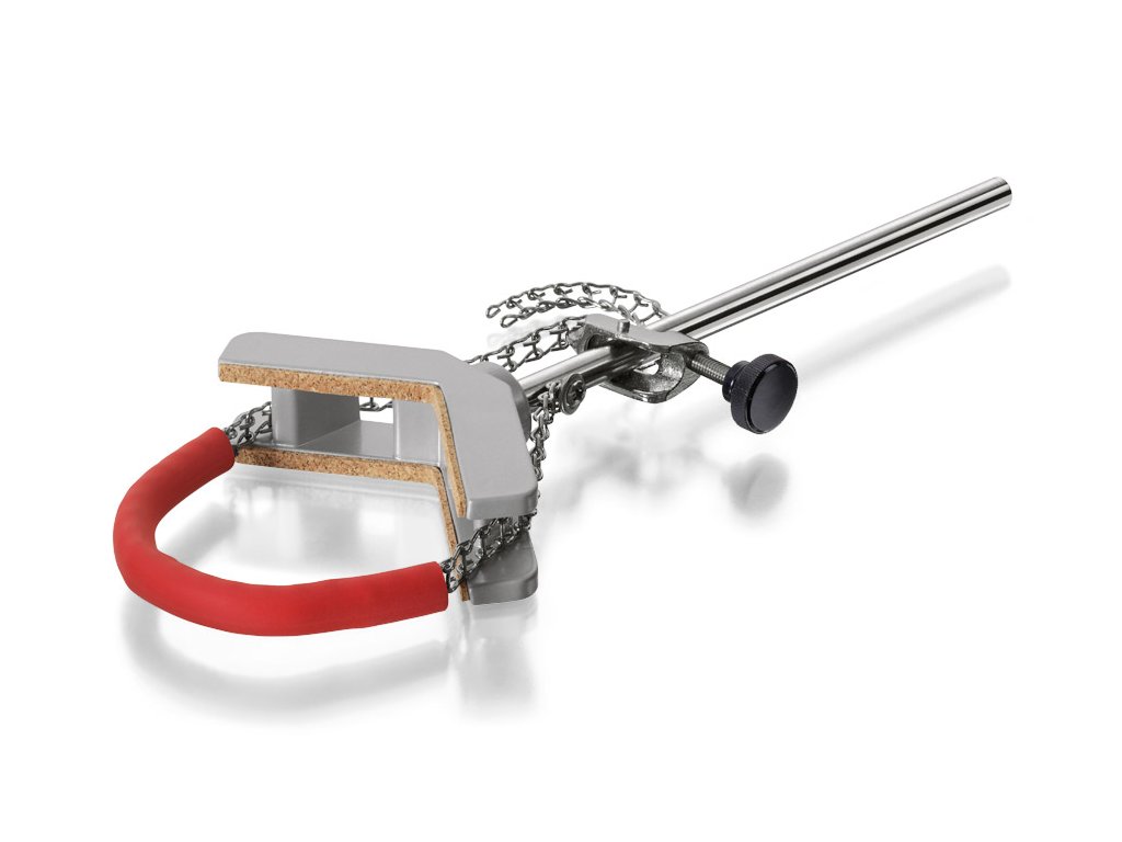 Reťazový laboratórny držiak s bezpečnostným uzáverom, čeľusťami s korokovou vložkou a tyčou Ø 10 mm.