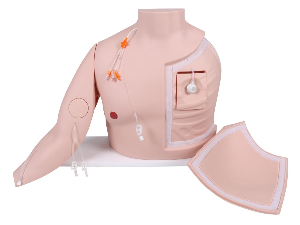 Model 7650 „Vascular Victor“ je komplexná tréningová pomôcka s funkčným implantovaným portom, centrálnym venóznym prístupom (CVC), tunneled CVC, a IV prístupom na predlaktí – vhodná na viacero techník a opakovaný výcvik.