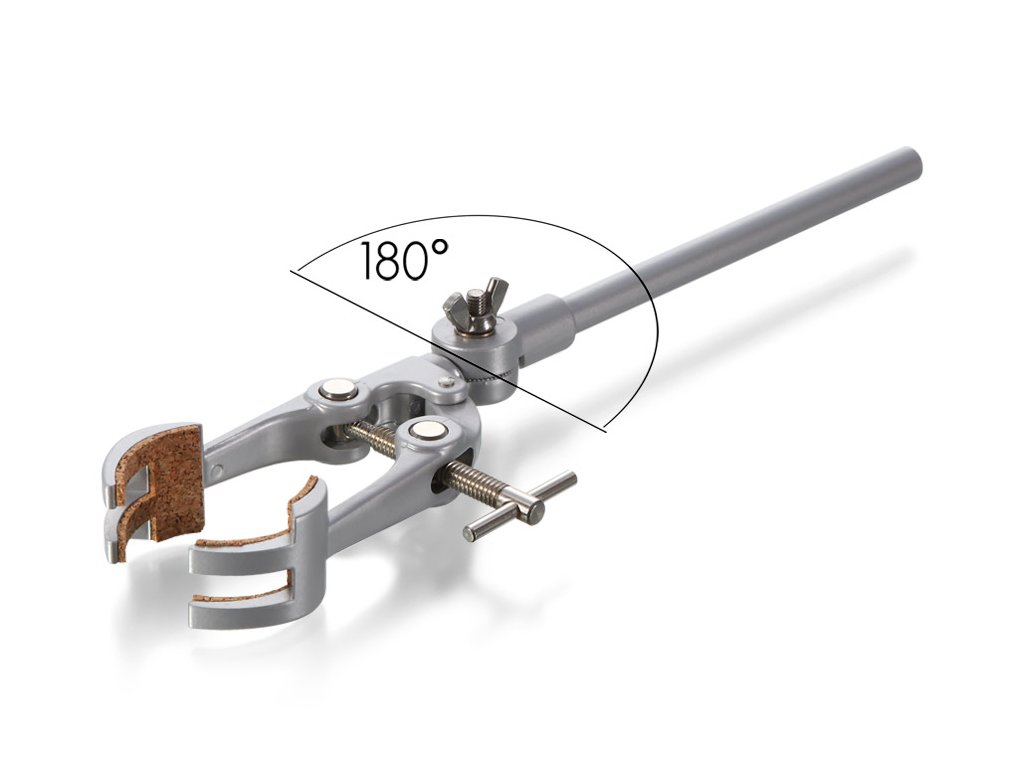 Univerzálny otočný laboratórny držiak je vyrobený z pozinkovanej tlakovej liatiny a má práškom lakovaný povrch, čo zaisťuje vysokú mechanickú odolnosť a dlhú životnosť. Čeľuste sú vystlané korokovou vložkou, ktorá poskytuje šetrné, neabrazívne a protišmykové uchytenie.