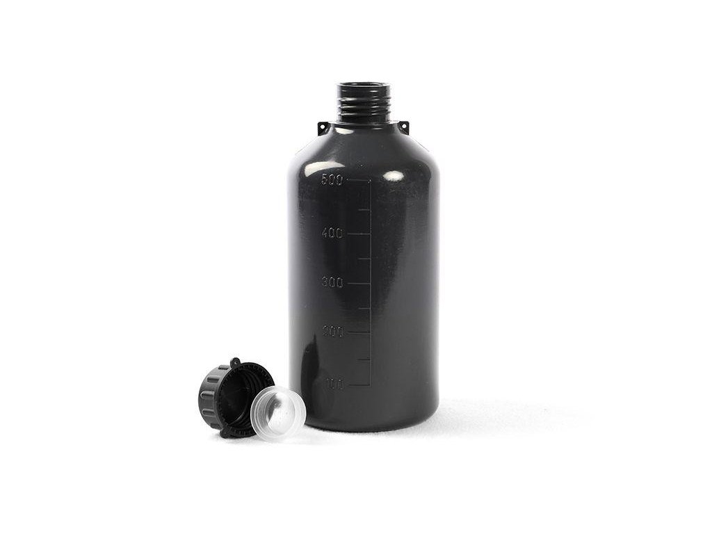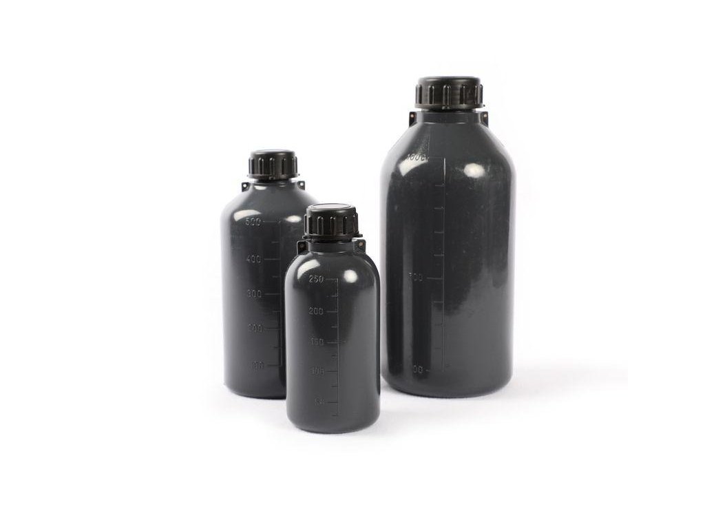 Úzkohrdlá šedá graduovaná fľaša je vyrobená z nízkohustotného polyetylénu (LDPE), potravinárskej kvality, vhodná aj pre fotocitlivé látky (napr. svetlocitlivé roztoky), v neutrálnej šedej farbe .