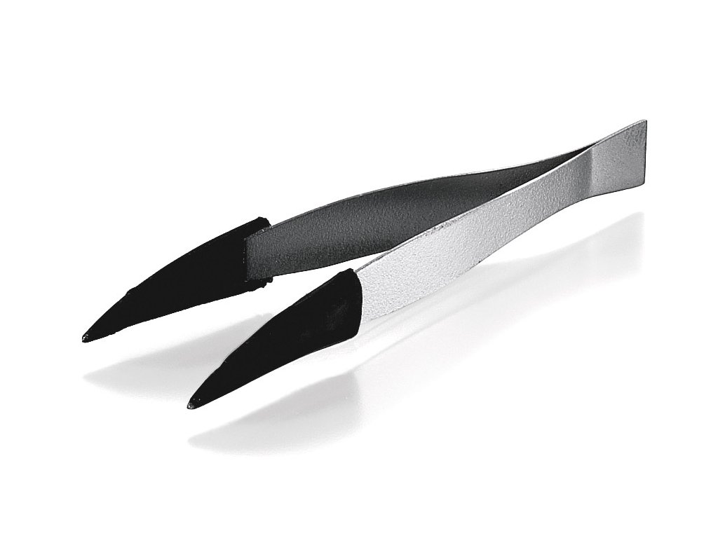 Zahnuté pinzety vyrobené z nehrdzavejúcej ocele 1.4301, s plastovými hrotmi, dĺžkou 90 mm a hmotnosťou 8 g.